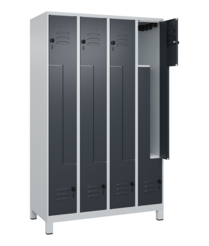 de belangrijkste maten van de C+P garderobekast Classic Plus in één oogopslag:per vak een kledingstang met 3 niet verdraaibare dubbele schuifhaken. openslaande deur met etikettenlijst en ventilatiesleuven. Door de binnenliggende penscharnieren zien de inliggende deuren er strak uit, want aan de buitenkant zijn geen schroeven of scharnieren zichtbaar. Dus de scharnieren doen geen afbreuk aan het design waardoor de hele kast er hoogwaardiger uitziet. Bovendien is het gladde oppervlak gemakkelijker te reinigen, zonder moeilijk bereikbare plaatsen waar vuil of stof zich kan ophopen. Elke deur is standaard uitgerust met een systeem voor gedempte sluiting , zodat de deur niet dichtslaat, zelfs niet wanneer deze een krachtige duw krijgt. Dit draagt niet alleen bij aan een rustigere werkomgeving, maar beschermt de stalen kast ook tegen beschadiging. Geïnspireerd door de natuur levert het BIONIC Steel Frame een bijzonder efficiënte en stabiele constructie op. De torsiestijfheid neemt verder toe door een ingenieuze structuur aan de binnenkant met plooien, steunen en tussenruimten, en door materiaalversterking op belangrijke punten, zoals aan de voorkant van de zijwanden en in de scheidingswand en kokerprofielen. Afsluitbaar met Veiligheidsdraaigrendel voor hangslot. Het veiligheidsslot is uitermate goed bestand tegen inbraak, omdat het doordraait wanneer het is vergrendeld en pas grijpt wanneer het slot is verwijderd. Passend voor alle hangsloten met een beugeldikte van 6 - 8 mm. De extra ventilatieopeningen in het vak, in combinatie met de ventilatiesleuven in de deur, verbeteren de luchtstroom. Dit zorgt voor een goede ventilatie in de kast waardoor de inhoud sneller droogt zonder onaangename geurtjes. Door de kunststof voeten onder de kast ziet de kast er niet alleen modern en minder massief uit, maar de voeten bieden ook praktische voordelen. De ruimte onder de kast is gemakkelijker schoon te maken en het kunststof van de voeten biedt een betere bescherming tegen corrosie. Vooral in omgevingen waar hogere eisen aan de hygiëne worden gesteld, is dit een belangrijk aspect. constructie van staal, stevig gelast. Dit maakt de constructie zeer robuust en sterk en dus duurzamer. Omdat de hoeken en randen van de romp gelast zijn, is de kast goed afgedicht en dus beter beschermd tegen stof, vocht en vuil dan bij een schroefconstructie. Bovendien is regelmatig onderhoud en nastellen niet nodig. romp met moffellak in RAL7035 lichtgrijs, front met moffellak in RAL7016 antracietgrijs.