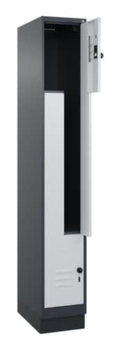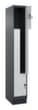 de belangrijkste maten van de C+P garderobekast Classic Plus in één oogopslag:per vak een kledingstang met 3 niet verdraaibare dubbele schuifhaken. openslaande deur met etikettenlijst en ventilatiesleuven. Door de binnenliggende penscharnieren zien de inliggende deuren er strak uit, want aan de buitenkant zijn geen schroeven of scharnieren zichtbaar. Dus de scharnieren doen geen afbreuk aan het design waardoor de hele kast er hoogwaardiger uitziet. Bovendien is het gladde oppervlak gemakkelijker te reinigen, zonder moeilijk bereikbare plaatsen waar vuil of stof zich kan ophopen. Elke deur is standaard uitgerust met een systeem voor gedempte sluiting , zodat de deur niet dichtslaat, zelfs niet wanneer deze een krachtige duw krijgt. Dit draagt niet alleen bij aan een rustigere werkomgeving, maar beschermt de stalen kast ook tegen beschadiging. Geïnspireerd door de natuur levert het BIONIC Steel Frame een bijzonder efficiënte en stabiele constructie op. De torsiestijfheid neemt verder toe door een ingenieuze structuur aan de binnenkant met plooien, steunen en tussenruimten, en door materiaalversterking op belangrijke punten, zoals aan de voorkant van de zijwanden en in de scheidingswand en kokerprofielen. Afsluitbaar met Veiligheidsdraaigrendel voor hangslot. Het veiligheidsslot is uitermate goed bestand tegen inbraak, omdat het doordraait wanneer het is vergrendeld en pas grijpt wanneer het slot is verwijderd. Passend voor alle hangsloten met een beugeldikte van 6 - 8 mm. De extra ventilatieopeningen in het vak, in combinatie met de ventilatiesleuven in de deur, verbeteren de luchtstroom. Dit zorgt voor een goede ventilatie in de kast waardoor de inhoud sneller droogt zonder onaangename geurtjes. De sokkel onder de kast zorgt ervoor dat het gewicht van de kast gelijkmatig over de vloer wordt verdeeld. Hierdoor staat de kast stabieler en kan hij zwaardere lasten dragen dan een kast met voeten. En omdat er geen vuil, stof en vocht onder kan komen, hoeft er onder de kast niet te worden schoongemaakt. constructie van staal, stevig gelast. Dit maakt de constructie zeer robuust en sterk en dus duurzamer. Omdat de hoeken en randen van de romp gelast zijn, is de kast goed afgedicht en dus beter beschermd tegen stof, vocht en vuil dan bij een schroefconstructie. Bovendien is regelmatig onderhoud en nastellen niet nodig. romp met moffellak in RAL7016 antracietgrijs, front met moffellak in RAL7035 lichtgrijs.