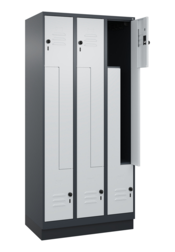 de belangrijkste maten van de C+P garderobekast Classic Plus in één oogopslag:per vak een kledingstang met 3 niet verdraaibare dubbele schuifhaken. openslaande deur met etikettenlijst en ventilatiesleuven. Door de binnenliggende penscharnieren zien de inliggende deuren er strak uit, want aan de buitenkant zijn geen schroeven of scharnieren zichtbaar. Dus de scharnieren doen geen afbreuk aan het design waardoor de hele kast er hoogwaardiger uitziet. Bovendien is het gladde oppervlak gemakkelijker te reinigen, zonder moeilijk bereikbare plaatsen waar vuil of stof zich kan ophopen. Elke deur is standaard uitgerust met een systeem voor gedempte sluiting , zodat de deur niet dichtslaat, zelfs niet wanneer deze een krachtige duw krijgt. Dit draagt niet alleen bij aan een rustigere werkomgeving, maar beschermt de stalen kast ook tegen beschadiging. Geïnspireerd door de natuur levert het BIONIC Steel Frame een bijzonder efficiënte en stabiele constructie op. De torsiestijfheid neemt verder toe door een ingenieuze structuur aan de binnenkant met plooien, steunen en tussenruimten, en door materiaalversterking op belangrijke punten, zoals aan de voorkant van de zijwanden en in de scheidingswand en kokerprofielen. Afsluitbaar met Veiligheidsdraaigrendel voor hangslot. Het veiligheidsslot is uitermate goed bestand tegen inbraak, omdat het doordraait wanneer het is vergrendeld en pas grijpt wanneer het slot is verwijderd. Passend voor alle hangsloten met een beugeldikte van 6 - 8 mm. De extra ventilatieopeningen in het vak, in combinatie met de ventilatiesleuven in de deur, verbeteren de luchtstroom. Dit zorgt voor een goede ventilatie in de kast waardoor de inhoud sneller droogt zonder onaangename geurtjes. De sokkel onder de kast zorgt ervoor dat het gewicht van de kast gelijkmatig over de vloer wordt verdeeld. Hierdoor staat de kast stabieler en kan hij zwaardere lasten dragen dan een kast met voeten. En omdat er geen vuil, stof en vocht onder kan komen, hoeft er onder de kast niet te worden schoongemaakt. constructie van staal, stevig gelast. Dit maakt de constructie zeer robuust en sterk en dus duurzamer. Omdat de hoeken en randen van de romp gelast zijn, is de kast goed afgedicht en dus beter beschermd tegen stof, vocht en vuil dan bij een schroefconstructie. Bovendien is regelmatig onderhoud en nastellen niet nodig. romp met moffellak in RAL7016 antracietgrijs, front met moffellak in RAL7035 lichtgrijs.