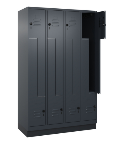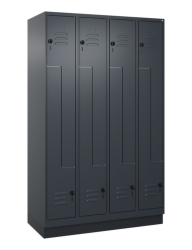 de belangrijkste maten van de C+P garderobekast Classic Plus in één oogopslag:per vak een kledingstang met 3 niet verdraaibare dubbele schuifhaken. openslaande deur met etikettenlijst en ventilatiesleuven. Door de binnenliggende penscharnieren zien de inliggende deuren er strak uit, want aan de buitenkant zijn geen schroeven of scharnieren zichtbaar. Dus de scharnieren doen geen afbreuk aan het design waardoor de hele kast er hoogwaardiger uitziet. Bovendien is het gladde oppervlak gemakkelijker te reinigen, zonder moeilijk bereikbare plaatsen waar vuil of stof zich kan ophopen. Elke deur is standaard uitgerust met een systeem voor gedempte sluiting , zodat de deur niet dichtslaat, zelfs niet wanneer deze een krachtige duw krijgt. Dit draagt niet alleen bij aan een rustigere werkomgeving, maar beschermt de stalen kast ook tegen beschadiging. Geïnspireerd door de natuur levert het BIONIC Steel Frame een bijzonder efficiënte en stabiele constructie op. De torsiestijfheid neemt verder toe door een ingenieuze structuur aan de binnenkant met plooien, steunen en tussenruimten, en door materiaalversterking op belangrijke punten, zoals aan de voorkant van de zijwanden en in de scheidingswand en kokerprofielen. Afsluitbaar met Veiligheidsdraaigrendel voor hangslot. Het veiligheidsslot is uitermate goed bestand tegen inbraak, omdat het doordraait wanneer het is vergrendeld en pas grijpt wanneer het slot is verwijderd. Passend voor alle hangsloten met een beugeldikte van 6 - 8 mm. De extra ventilatieopeningen in het vak, in combinatie met de ventilatiesleuven in de deur, verbeteren de luchtstroom. Dit zorgt voor een goede ventilatie in de kast waardoor de inhoud sneller droogt zonder onaangename geurtjes. De sokkel onder de kast zorgt ervoor dat het gewicht van de kast gelijkmatig over de vloer wordt verdeeld. Hierdoor staat de kast stabieler en kan hij zwaardere lasten dragen dan een kast met voeten. En omdat er geen vuil, stof en vocht onder kan komen, hoeft er onder de kast niet te worden schoongemaakt. constructie van staal, stevig gelast. Dit maakt de constructie zeer robuust en sterk en dus duurzamer. Omdat de hoeken en randen van de romp gelast zijn, is de kast goed afgedicht en dus beter beschermd tegen stof, vocht en vuil dan bij een schroefconstructie. Bovendien is regelmatig onderhoud en nastellen niet nodig. romp met moffellak in RAL7016 antracietgrijs, front met moffellak in RAL7016 antracietgrijs.