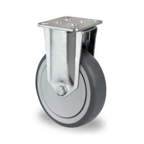 met vloervriendelijke TPE-banden. diameter 150 mm. naaf met voor continu gebruik geschikte kogellager. naaf lengte 36 mm. velg van breukvast polypropyleen. behuizing van staal galvanisch verzinkt en blauw gepassiveerd. bevestiging met plaat.