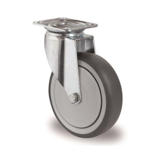 met vloervriendelijke TPE-banden. diameter 100 mm. naaf met voor continu gebruik geschikte kogellager. naaf lengte 36 mm. velg van breukvast polypropyleen. behuizing van staal galvanisch verzinkt en blauw gepassiveerd. bevestiging met plaat.