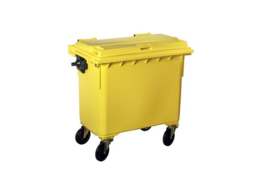 "longDescription": "Vuilnisbak met 4 wielen van polyethyleen met hoge dichtheid 660L geel, uitsluitend van nieuw materiaal, UV-, koude-, hitte- en chemicaliënbestendig, brede handgrepen aan het deksel, lichtlopende wielen van massief rubber, massieve stalen wielas, gegalvaniseerd, pedaal als toebehoren -alleen voor 120L, volgens norm: DIN30740/EN840, ring voor zakhouder -alleen voor 120L<br>",