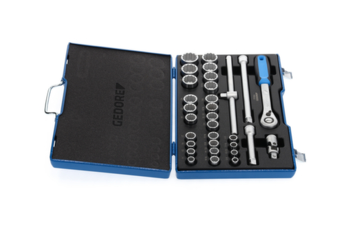 "longDescription": "Met gesmede, geharde en getemperde, handbediende 12-punts UD profielbussen, Met bedieningsgereedschappen van vanadiumstaal 31CrV3, Met robuuste hefboomratel, met drukknopontgrendeling, In GEDORE blauw plaatstalen koffer, Afmetingen: 425 x 277 x 55 mm<br>",