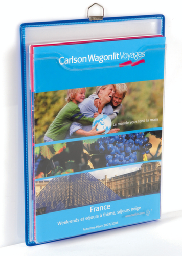 "longDescription": "<h2>Hangende folderhouder</h2><strong>de doeltreffende reclamepresentatie</strong><br><ul><li><strong>voor losse vellen of hele brochures</strong></li><li><strong>robuust en opvallend</strong> - frame van staaldraad met gekleurde kunststof mantel</li><li><strong>eenvoudige bevestiging</strong> met behulp van metalen ogen</li><li>voor maximaal 150 vellen à 80 g/m²</li><li>bord van kunststof</li></ul>",