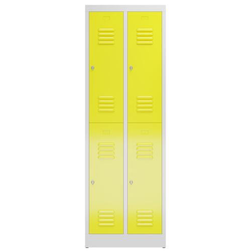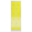 per vak 1 kledingstang en 2 dubbele haken per vak. openslaande deur met ventilatiesleuven. afsluitbaar met klinksluiting voor hangslot. elk vak apart afsluitbaar. De sokkel onder de kast zorgt ervoor dat het gewicht van de kast gelijkmatig over de vloer wordt verdeeld. Hierdoor staat de kast stabieler en kan hij zwaardere lasten dragen dan een kast met voeten. En omdat er geen vuil, stof en vocht onder kan komen, hoeft er onder de kast niet te worden schoongemaakt. constructie van staal, gelast. romp met elektrostatische poedercoating in RAL7035 lichtgrijs, front met elektrostatische poedercoating in RAL1018 zinkgeel.