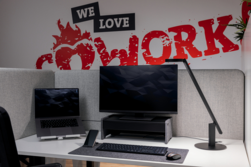 geschikt voor ergonomisch werken en het besparen van ruimte. Ten eerste staat de laptop of monitor dankzij de staander op een ideale ooghoogte, waardoor de ruggengraat wordt ontzien. Ten tweede heeft u extra opbergruimte onder/rondom de staander voor een opgeruimde werkplek.