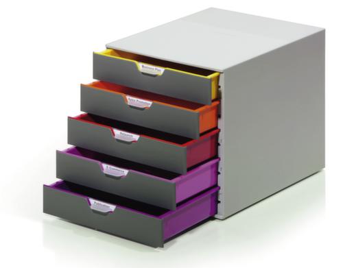 "longDescription": "<h2>Ladebak</h2><strong>klassiek ontwerp met een modern tintje</strong><br><ul><li>Perfect georganiseerd en alles binnen handbereik - met fijne gekleurde lijnen wanneer de laden gesloten zijn</li><li>Kan individueel worden geëtiketteerd - inclusief etiketteringsvensters en vervangbare insteeketiketten</li><li>Licht en stil - geruisloze laden met uittrekstops</li><li>Stabiel - gemaakt van plastic</li><li>Stabiel - met anti-slip voetjes</li></ul><br>Schep orde met systeem en ontwerp! <br>De VARICOLOR® ladebox van Durable helpt niet alleen om nog meer orde te scheppen, hij ziet er ook nog eens fantastisch uit! Fijne kleurlijnen op de laden contrasteren met het effen grijze lichaam. De ladebox is niet alleen visueel aantrekkelijk, maar ook functioneel! Omdat de gekleurde lijnen helpen bij een betere oriëntatie en organisatie op uw bureau.<br><br>De ladebak is gemaakt van kunststof. De romp is lichtgrijs, de fronten van de laden zijn donkergrijs. De lades zijn van binnen gekleurd. De kleur is van buitenaf zichtbaar als een dunne streep wanneer de laden gesloten zijn. Elke lade heeft een andere kleur, waardoor een mooi kleurverloop ontstaat door de overeenkomstige opstelling. De doos hoeft dus niet te worden verstopt en kan ook goed zichtbaar op uw bureau staan.<br><br>De laden zijn geschikt voor formaten tot DIN A4, C4 en ook voor folio- en briefformaten. Met andere woorden, geschikt voor de meest gangbare papierformaten op kantoor.<br>Orde op de werkvloer heeft ook structuur nodig! Voor een optimale oriëntatie gebruikt u gewoon de bijgevoegde etiketteringsvensters. Deze kunnen individueel worden geëtiketteerd met gemakkelijk vervangbare insteeketiketten. Etiketteren met de computer is ook mogelijk. Zodat jij en anderen precies weten waar ze wat kunnen vinden.<br><br>De laden hebben een geruisloze soepele loop. Geen rukken meer aan de lades, geen irritante geluiden. Bovendien is de ladebak voorzien van een uittrekstop. Dit voorkomt dat de lade per ongeluk helemaal wordt uitgetrokken. Bijna iedereen kent het probleem en het daaropvolgende spel van geduld om de lade en de inhoud ervan weer op het juiste spoor te krijgen. De uittrekstop zal dit voorkomen!<br><br>Aan de onderzijde van de ladebak bevinden zich antislipvoetjes van kunststof. Zo blijft hij goed op zijn plaats. De box kan dus worden gestapeld of in rijen worden geplaatst op alle dressoirs en kantoorkasten met standaardafmetingen. Het elegante ontwerp van de ladekast maakt hem geschikt voor vrijwel elke omgeving.<br><br>U kunt kiezen tussen een box met 5, 7 of 10 laden. Of u kunt er meerdere nemen met verschillende aantallen laden en ze naast of op elkaar zetten. Dit is mogelijk omdat de ladeboxen ondanks het verschillende aantal laden dezelfde buitenafmetingen hebben.<br>",