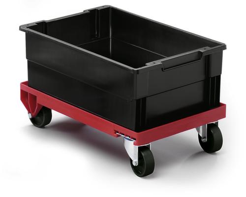 maten afgestemd op europallet. platform van kunststof, met afrolrand. constructie van slagvast polyethyleen in rood. De 2 zwenk- en 2 bokwielen die eronder zijn gemonteerd, sporen uitstekend en rollen moeiteloos op rechte en bochtige trajecten, waardoor rijden weinig krachtsinspanning kost. met breukvaste en robuuste polypropyleen-banden.