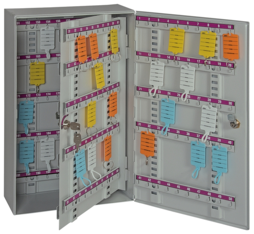 uitgerust met afzonderlijk verstelbare, doorlopend genummerde hakenlijst voor een gebruiksvriendelijke organisatie van sleutels. Dankzij de openslaande deur heeft u zowel een tegen stof beschermde opslag als een goed overzicht. afsluitbaar met cilinderslot. vergrendeling éénzijdig. constructie van plaatstaal. romp met slag- en krasvaste poedercoating in RAL7035 lichtgrijs. front met slag- en krasvaste poedercoating in RAL7035 lichtgrijs. 1DA1E9CBF09DA14CACC1996C68D4375B.