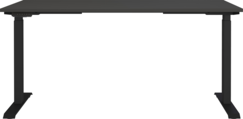 blad van spaanplaat met onderhoudsvriendelijke melamineharscoating in decor grafiet. rand met slagvaste ABS-omranding ter bescherming tegen lelijke barsten en beschadigingen. T-voetonderstel van metaal met slag- en krasvaste poedercoating in zwart. hoogteverstelling door elektrische motor. functies: Opslaan en automatisch oproepen van geprogrammeerde tafelhoogtes dankzij memoryfunctie. frame met nivelleerbare kunststof glijders, ideaal voor het opheffen van oneffenheden in de vloer. Met stroomkabel, stekker en bedieningseenheid elektrificeerbaar.