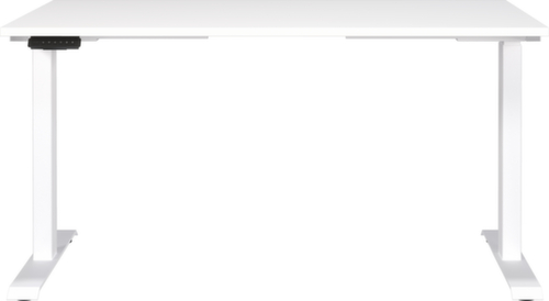 blad van spaanplaat met krasvaste en onderhoudsvriendelijke melamineharscoating in decor wit. rand alle randen zijn door slagvaste ABS-randen beschermd tegen ontsierende scheuren en beschadigingen. T-voetonderstel van metaal met slag- en krasvaste poedercoating in wit. frame met Het onderstel kan eenvoudig worden aangepast aan ongelijke vloeren dankzij de ingebouwde stelvoetjes, zodat de tafel altijd recht staat, zelfs bij tapijtranden.