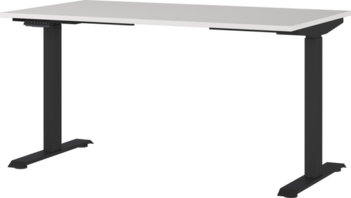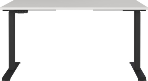 blad van spaanplaat met onderhoudsvriendelijke melamineharscoating in decor lichtgrijs. plaatvorm hoekig. rand alle randen zijn door slagvaste ABS-randen beschermd tegen ontsierende scheuren en beschadigingen. C-voetonderstel van metaal met slag- en krasvaste poedercoating in zwart. hoogteverstelling door 2 elektromotoren ondersteunen met een comfortabele hoogteverstelling met één druk op de knop. De automatische botsingbescherming stopt onmiddellijk bij weerstand van boven of onder en zorgt zo voor absolute veiligheid. frame met Kunststof glijders.