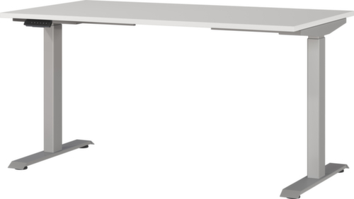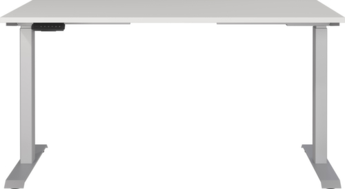 blad van spaanplaat met onderhoudsvriendelijke melamineharscoating in decor lichtgrijs. plaatvorm hoekig. rand alle randen zijn door slagvaste ABS-randen beschermd tegen ontsierende scheuren en beschadigingen. C-voetonderstel van metaal met slag- en krasvaste poedercoating in zilverkleurig. hoogteverstelling door 2 elektromotoren ondersteunen met een comfortabele hoogteverstelling met één druk op de knop. De automatische botsingbescherming stopt onmiddellijk bij weerstand van boven of onder en zorgt zo voor absolute veiligheid. frame met Kunststof glijders.