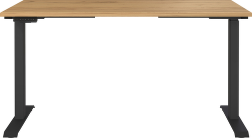 blad van spaanplaat met onderhoudsvriendelijke melamineharscoating in decor Navarra-eiken. plaatvorm hoekig. rand alle randen zijn door slagvaste ABS-randen beschermd tegen ontsierende scheuren en beschadigingen. C-voetonderstel van metaal met slag- en krasvaste poedercoating in zwart. hoogteverstelling door 2 elektromotoren ondersteunen met een comfortabele hoogteverstelling met één druk op de knop. De automatische botsingbescherming stopt onmiddellijk bij weerstand van boven of onder en zorgt zo voor absolute veiligheid. frame met Kunststof glijders.