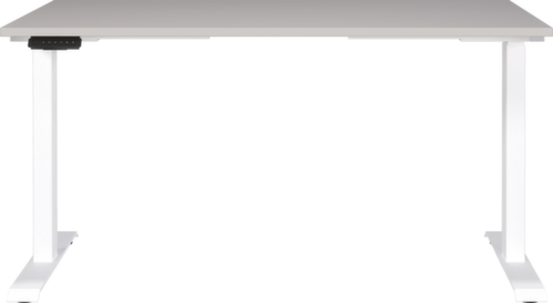 blad van spaanplaat met onderhoudsvriendelijke melamineharscoating in decor decor kasjmier. plaatvorm hoekig. rand alle randen zijn door slagvaste ABS-randen beschermd tegen ontsierende scheuren en beschadigingen. C-voetonderstel van metaal met slag- en krasvaste poedercoating in wit. hoogteverstelling door 2 elektromotoren ondersteunen met een comfortabele hoogteverstelling met één druk op de knop. De automatische botsingbescherming stopt onmiddellijk bij weerstand van boven of onder en zorgt zo voor absolute veiligheid. frame met Kunststof glijders.
