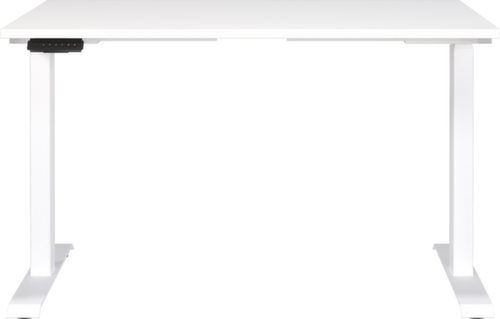 blad van spaanplaat met krasvaste en onderhoudsvriendelijke melamineharscoating in decor wit. plaatvorm hoekig. rand met slagvaste ABS-omranding ter bescherming tegen lelijke barsten en beschadigingen. dubbel T-voetonderstel van metaal met slag- en krasvaste poedercoating in wit. hoogteverstelling door elektrische motor. frame met nivelleerbare kunststof glijders, ideaal voor het opheffen van oneffenheden in de vloer. Met stroomkabel, stekker en bedieningseenheid elektrificeerbaar.
