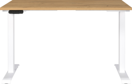 blad van spaanplaat met krasvaste en onderhoudsvriendelijke melamineharscoating in decor Grandson-eiken. plaatvorm hoekig. rand met slagvaste ABS-omranding ter bescherming tegen lelijke barsten en beschadigingen. dubbel T-voetonderstel van metaal met slag- en krasvaste poedercoating in wit. hoogteverstelling door elektrische motor. frame met nivelleerbare kunststof glijders, ideaal voor het opheffen van oneffenheden in de vloer. Met stroomkabel, stekker en bedieningseenheid elektrificeerbaar.