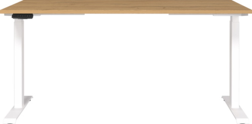 blad van spaanplaat met krasvaste en onderhoudsvriendelijke melamineharscoating in decor Grandson-eiken. rand met slagvaste ABS-omranding ter bescherming tegen lelijke barsten en beschadigingen. dubbel T-voetonderstel van metaal met slag- en krasvaste poedercoating in wit. frame met nivelleerbare kunststof glijders, ideaal voor het opheffen van oneffenheden in de vloer. Met stroomkabel, stekker en bedieningseenheid elektrificeerbaar.