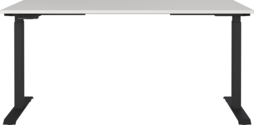 blad van spaanplaat met krasvaste en onderhoudsvriendelijke melamineharscoating in decor lichtgrijs. rand met slagvaste ABS-omranding ter bescherming tegen lelijke barsten en beschadigingen. dubbel T-voetonderstel van metaal met slag- en krasvaste poedercoating in zwart. frame met nivelleerbare kunststof glijders, ideaal voor het opheffen van oneffenheden in de vloer. Met stroomkabel, stekker en bedieningseenheid elektrificeerbaar.