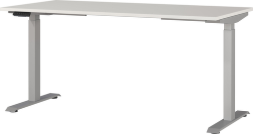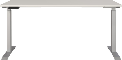 blad van spaanplaat met krasvaste en onderhoudsvriendelijke melamineharscoating in decor lichtgrijs. rand met slagvaste ABS-omranding ter bescherming tegen lelijke barsten en beschadigingen. dubbel T-voetonderstel van metaal met slag- en krasvaste poedercoating in zilverkleurig. frame met nivelleerbare kunststof glijders, ideaal voor het opheffen van oneffenheden in de vloer. Met stroomkabel, stekker en bedieningseenheid elektrificeerbaar.