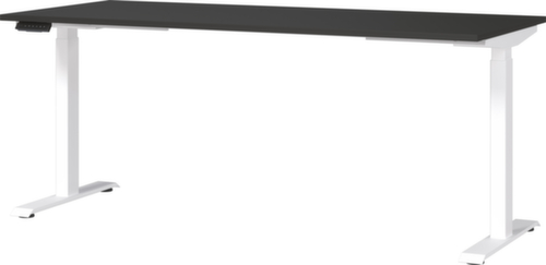 blad van spaanplaat met onderhoudsvriendelijke melamineharscoating in decor grafiet. rand met slagvaste ABS-omranding ter bescherming tegen lelijke barsten en beschadigingen. dubbel T-voetonderstel van metaal met slag- en krasvaste poedercoating in wit. frame met nivelleerbare kunststof glijders, ideaal voor het opheffen van oneffenheden in de vloer. Met stroomkabel, stekker en bedieningseenheid elektrificeerbaar.