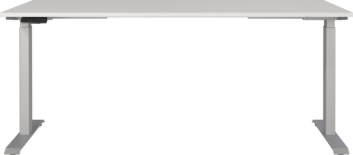 blad van spaanplaat met onderhoudsvriendelijke melamineharscoating in decor lichtgrijs. rand met slagvaste ABS-omranding ter bescherming tegen lelijke barsten en beschadigingen. dubbel T-voetonderstel van metaal met slag- en krasvaste poedercoating in zilverkleurig. frame met nivelleerbare kunststof glijders, ideaal voor het opheffen van oneffenheden in de vloer. Met stroomkabel, stekker en bedieningseenheid elektrificeerbaar.