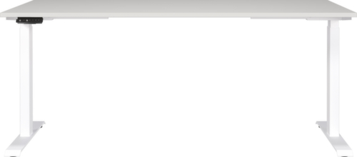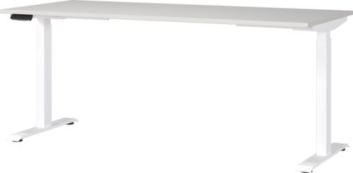 blad van spaanplaat met onderhoudsvriendelijke melamineharscoating in decor lichtgrijs. rand met slagvaste ABS-omranding ter bescherming tegen lelijke barsten en beschadigingen. dubbel T-voetonderstel van metaal met slag- en krasvaste poedercoating in wit. frame met nivelleerbare kunststof glijders, ideaal voor het opheffen van oneffenheden in de vloer. Met stroomkabel, stekker en bedieningseenheid elektrificeerbaar.