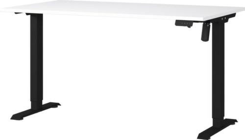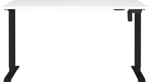 blad van spaanplaat met onderhoudsvriendelijke melamineharscoating in decor wit. rand met slagvaste ABS-omranding ter bescherming tegen lelijke barsten en beschadigingen. T-voetonderstel van metaal met slag- en krasvaste poedercoating in zwart. hoogteverstelling door elektrische motor. frame met nivelleerbare kunststof glijders, ideaal voor het opheffen van oneffenheden in de vloer.