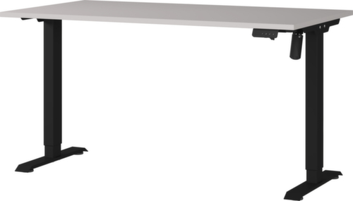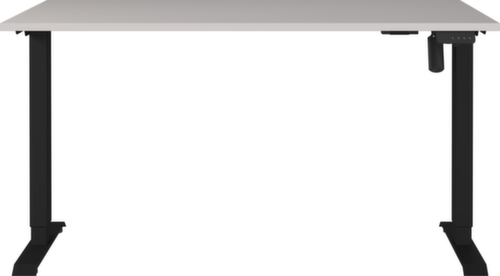 blad van spaanplaat met onderhoudsvriendelijke melamineharscoating in decor decor kasjmier. rand met slagvaste ABS-omranding ter bescherming tegen lelijke barsten en beschadigingen. T-voetonderstel van metaal met slag- en krasvaste poedercoating in zwart. hoogteverstelling door elektrische motor. frame met nivelleerbare kunststof glijders, ideaal voor het opheffen van oneffenheden in de vloer.