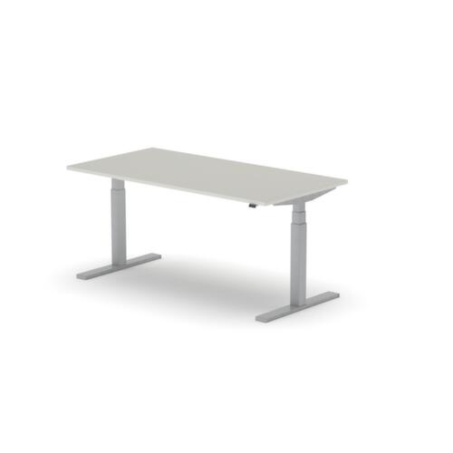 blad van spaanplaat met onderhoudsvriendelijke melamineharscoating in decor MB White Grey. plaatvorm rechthoekig. T-voetonderstel in RAL9006 blank aluminiumkleurig. hoogteverstelling door elektromotor met handschakelaar. met eurostekker.