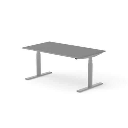 blad van spaanplaat met onderhoudsvriendelijke melamineharscoating in decor MS Slate. plaatvorm rechthoekig. T-voetonderstel in RAL9006 blank aluminiumkleurig. hoogteverstelling door elektromotor met handschakelaar en display. functies: Opslaan en automatisch oproepen van geprogrammeerde tafelhoogtes dankzij memoryfunctie. met eurostekker.