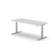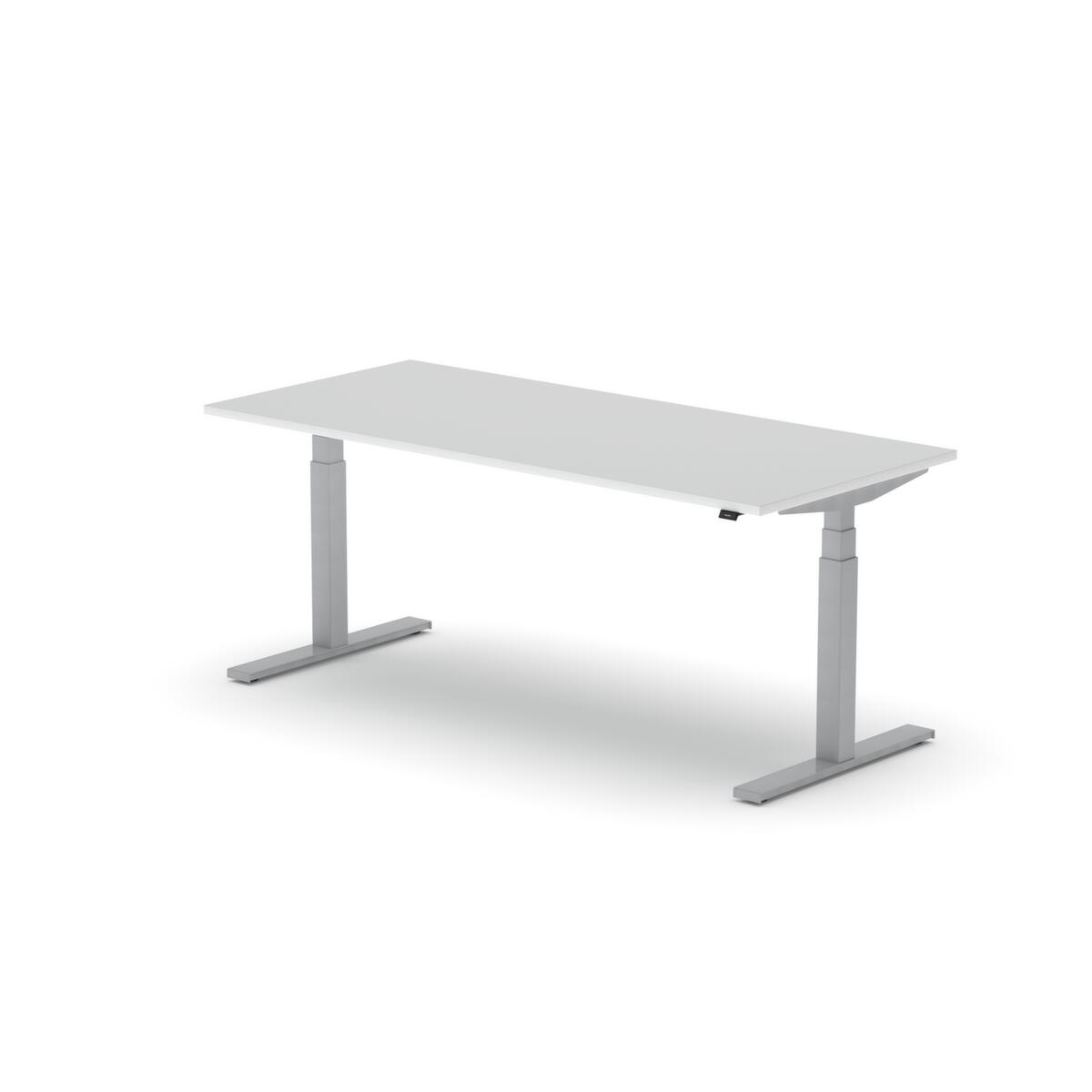 blad van spaanplaat met onderhoudsvriendelijke melamineharscoating in decor BI White. plaatvorm rechthoekig. T-voetonderstel in RAL9006 blank aluminiumkleurig. hoogteverstelling door elektromotor met handschakelaar. met eurostekker.