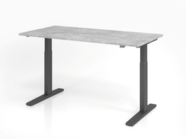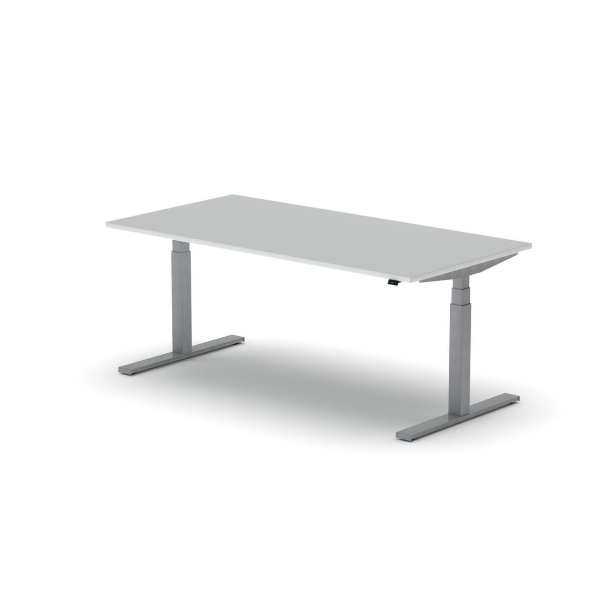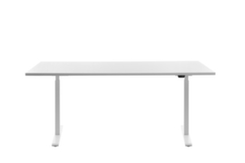 blad van spaanplaat met onderhoudsvriendelijke melamineharscoating in decor BI White. plaatvorm rechthoekig. T-voetonderstel in RAL9006 blank aluminiumkleurig. hoogteverstelling door elektromotor met handschakelaar. met eurostekker.
