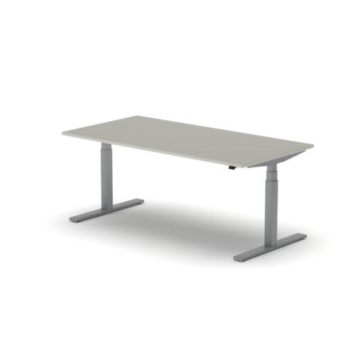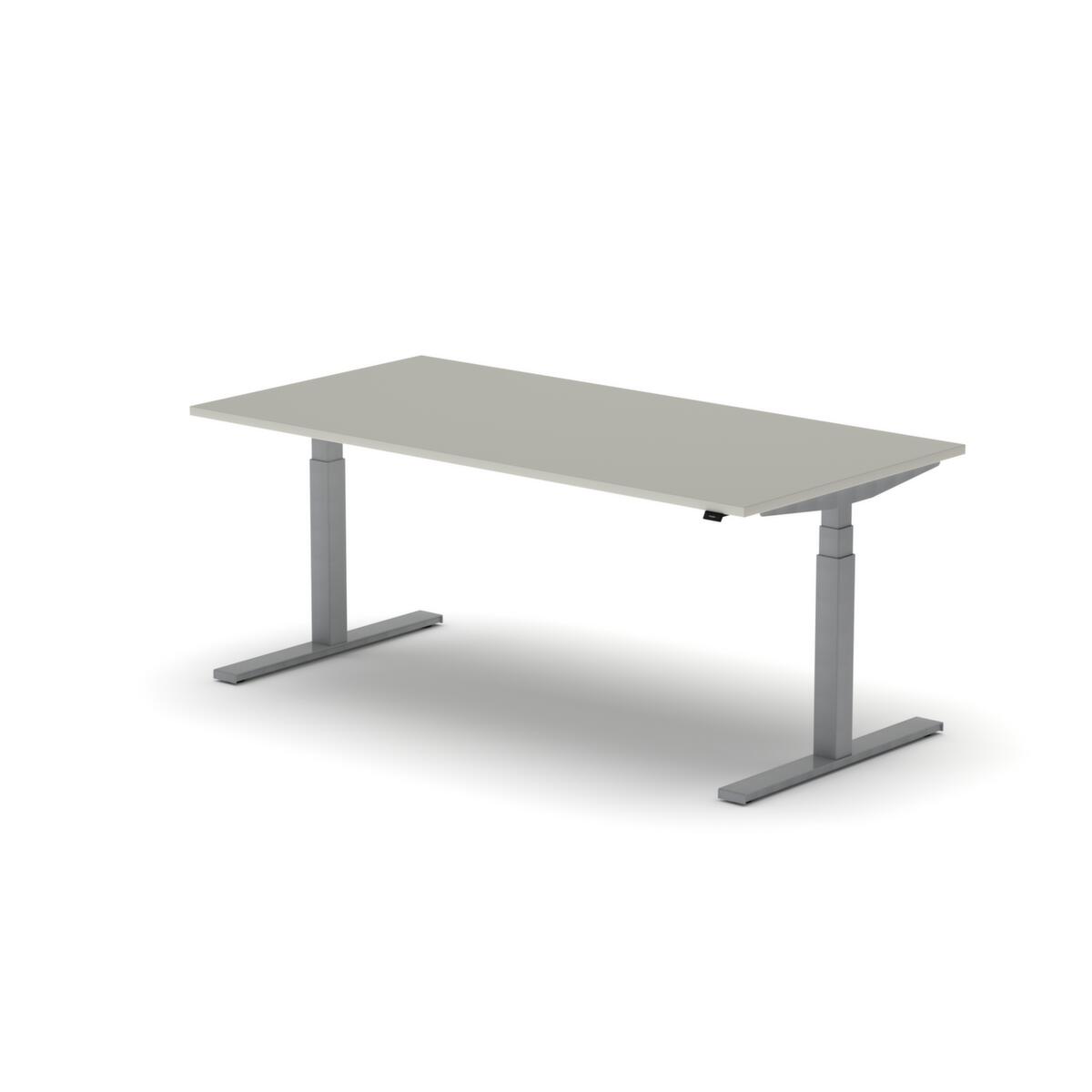 blad van spaanplaat met onderhoudsvriendelijke melamineharscoating in decor MB White Grey. plaatvorm rechthoekig. T-voetonderstel in RAL9006 blank aluminiumkleurig. hoogteverstelling door elektromotor met handschakelaar en display. functies: Opslaan en automatisch oproepen van geprogrammeerde tafelhoogtes dankzij memoryfunctie. met eurostekker.