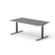 blad van spaanplaat met onderhoudsvriendelijke melamineharscoating in decor MS Slate. plaatvorm rechthoekig. T-voetonderstel in RAL9005 gitzwart. hoogteverstelling door elektromotor met handschakelaar en display. functies: Opslaan en automatisch oproepen van geprogrammeerde tafelhoogtes dankzij memoryfunctie. met eurostekker.