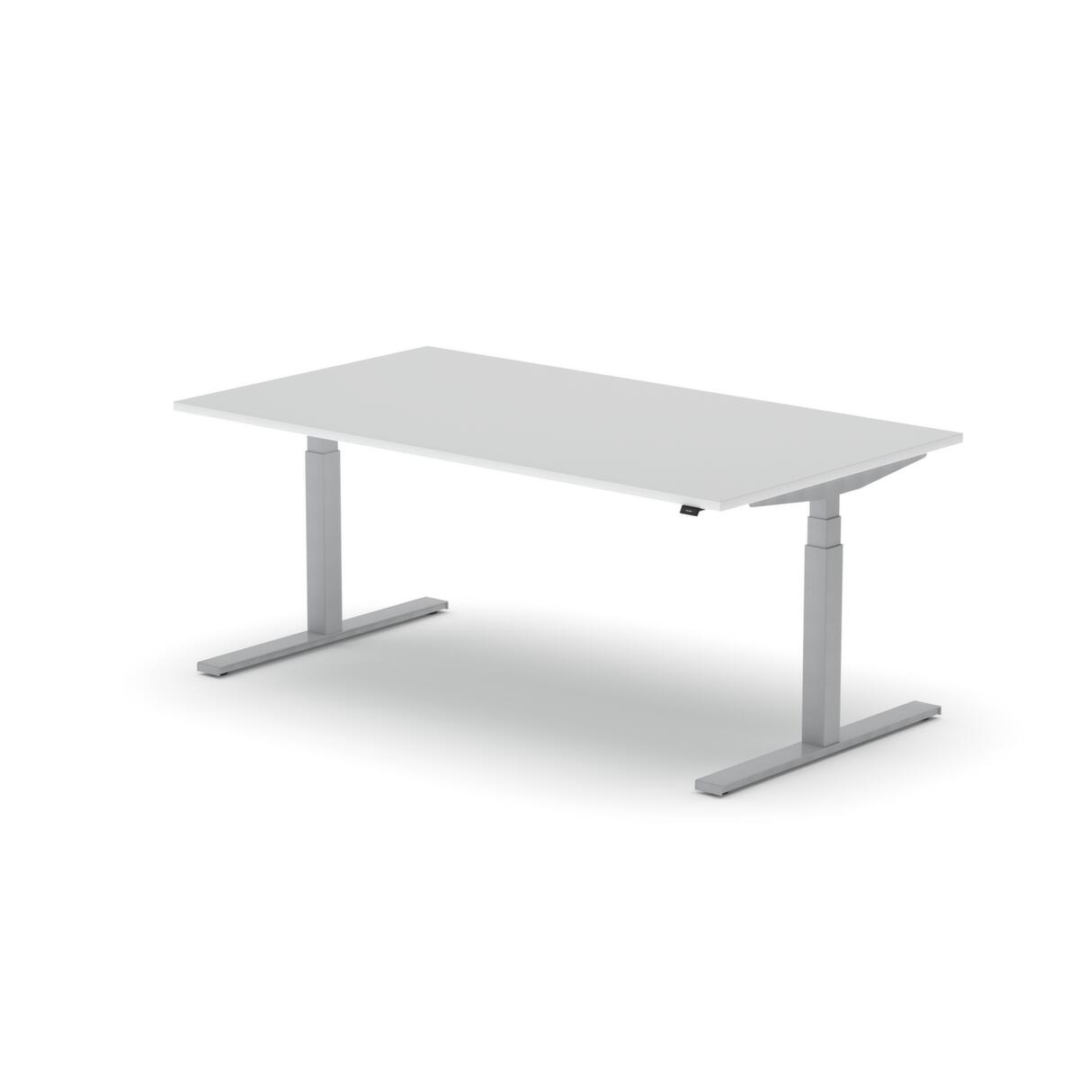 blad van spaanplaat met onderhoudsvriendelijke melamineharscoating in decor BI White. plaatvorm rechthoekig. T-voetonderstel in RAL9006 blank aluminiumkleurig. hoogteverstelling door elektromotor met handschakelaar. met eurostekker.