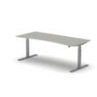 blad van spaanplaat met onderhoudsvriendelijke melamineharscoating in decor MB White Grey. plaatvorm gewelfd. T-voetonderstel in RAL9006 blank aluminiumkleurig. hoogteverstelling door elektromotor met handschakelaar en display. functies: Opslaan en automatisch oproepen van geprogrammeerde tafelhoogtes dankzij memoryfunctie. met eurostekker.