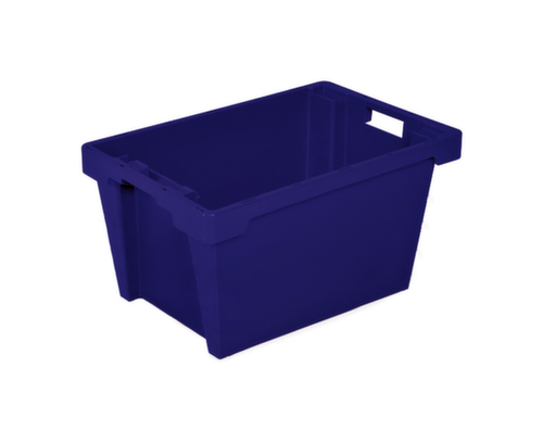 van slagvast polyethyleen in blauw. wanden gesloten, bodem gesloten. eenvoudig te dragen door open greep. Nestbaar door 180°-draaiing. geschikt voor levensmiddelen. Geschikt voor rollenbanen. temperatuurbestendig van -40 °C tot +60 °C.