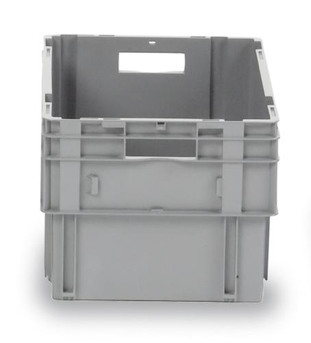 van breukvast polypropyleen in grijs. wanden gesloten, bodem gesloten met versteviging door verstevigingsribben. eenvoudig te dragen door open greep. etikethouder op de grepen. Nestbaar door 180°-draaiing. geschikt voor levensmiddelen. Geschikt voor rollenbanen.