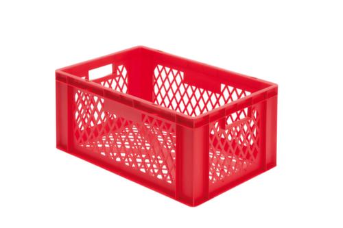 maten afgestemd op europallet. van breukvast polypropyleen in rood. Wanden doorbroken, bodem doorbroken. eenvoudig transport door draaggrepen. Meervoudig stapelbaar. geschikt voor levensmiddelen. Geschikt voor rollenbanen. Temperatuurbestendig -20 °C tot +80 °C. Geschikt voor verschillende stoffen, gelieve aan te vragen.