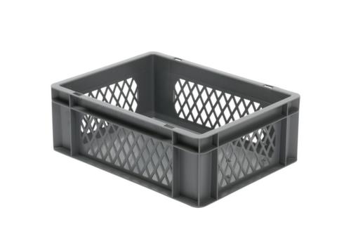 maten afgestemd op europallet. van breukvast polypropyleen in grijs. Wanden doorbroken, bodem gesloten. Meervoudig stapelbaar. geschikt voor levensmiddelen. Geschikt voor rollenbanen. Temperatuurbestendig -20 °C tot +80 °C. Geschikt voor verschillende stoffen, gelieve aan te vragen.