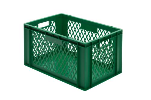 maten afgestemd op europallet. van breukvast polypropyleen in groen. Wanden doorbroken, bodem gesloten. eenvoudig transport door draaggrepen. Meervoudig stapelbaar. geschikt voor levensmiddelen. Geschikt voor rollenbanen. Temperatuurbestendig -20 °C tot +80 °C. Geschikt voor verschillende stoffen, gelieve aan te vragen.