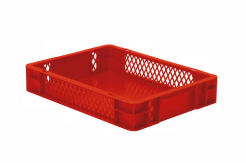 maten afgestemd op europallet. van breukvast polypropyleen in rood. Wanden doorbroken, bodem gesloten. Meervoudig stapelbaar. geschikt voor levensmiddelen. Geschikt voor rollenbanen. Temperatuurbestendig -20 °C tot +80 °C.