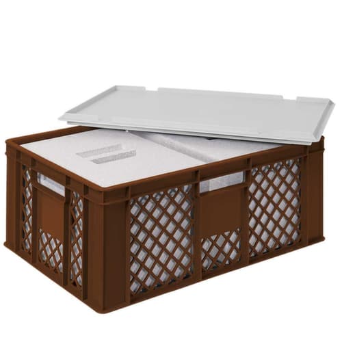 de belangrijkste maten van de stapelbak in één oogopslag:In euromaat. van hogedruk-polyethyleen (isoleerbox van geëxpandeerd polystyreen) in bruin. wanden doorbroken. oplegdeksel voor interne isoleerbox. eenvoudig transport door open greep. Zowel met als zonder deksel veilig meervoudig stapelbaar. geschikt voor levensmiddelen. Temperatuurbestendig -40 °C tot +60 °C, korte tijd tot +75 °C. Geschikt voor zuren, basen en vetten.
