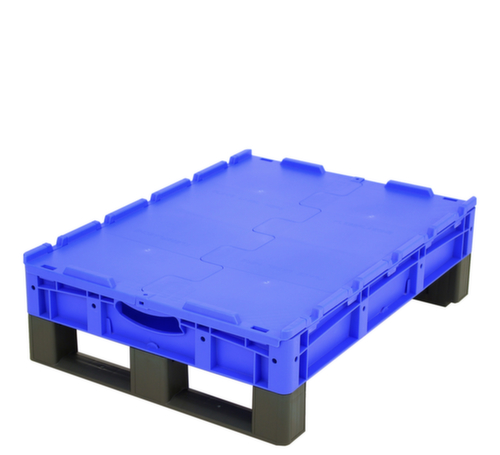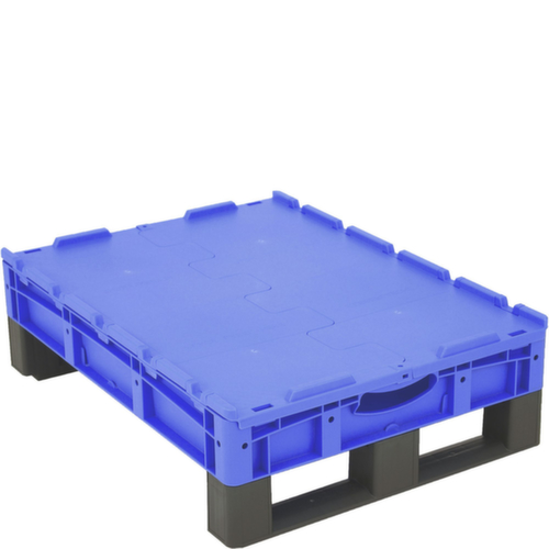 maten afgestemd op europallet. van breukvast polypropyleen in blauw. Wanden gesloten, bodem dubbel verstevigd. De opgeslagen goederen zijn beschermd tegen stof en vuil door de tweedelige scharnierdeksel. eenvoudig transport door open greep. met etikethouder aan alle zijden. Meervoudig stapelbaar. geschikt voor levensmiddelen. Geschikt voor verschillende stoffen, gelieve aan te vragen.