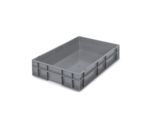 maten afgestemd op europallet. van breukvast polypropyleen in grijs. Wanden gesloten, bodem gesloten. eenvoudig transport door gesloten greepgaten. Meervoudig stapelbaar. Geschikt voor rollenbanen. Temperatuurbestendig -10 °C tot +80 °C. Recyclebaar.