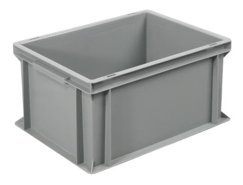 maten afgestemd op europallet. van breukvast polypropyleen in grijs. Wanden gesloten, bodem gesloten. Bodem met versteviging door verstevigingsribben. eenvoudig transport door verzonken greep. Meervoudig stapelbaar. geschikt voor levensmiddelen. Geschikt voor rollenbanen. Temperatuurbestendig -20 °C tot +80 °C. Geschikt voor verschillende stoffen, gelieve aan te vragen.