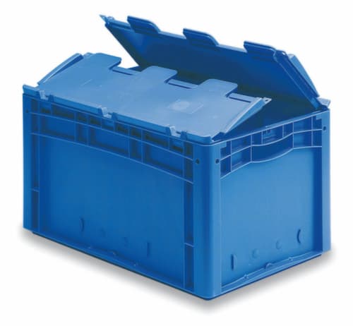 maten afgestemd op europallet. van breukvast polypropyleen in blauw. Wanden gesloten, bodem gesloten. Bodem met versteviging door verstevigingsribben. De opgeslagen goederen zijn beschermd tegen stof en vuil door de tweedelige scharnierdeksel. eenvoudig transport door draaggrepen. Meervoudig stapelbaar. geschikt voor levensmiddelen.