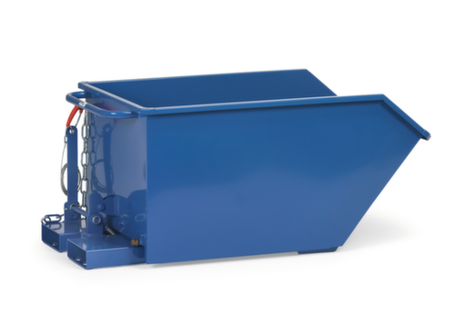 De belangrijkste maten van de fetra kiepbak in één oogopslagHandig kiepen vanaf de bestuurdersstoel dankzij trekkoordontgrendeling. Keert terug naar basispositie door neerzetten op de vloer en de kantelbeveiliging klikt weer automatisch vast. Met een beveiligingsketting aan de vorksloffen van de heftruck kan de kiepbak extra worden beveiligd tegen wegglijden . De kiepbak is ook geschikt voor de opname van vloeistoffen - olie en waterdicht gelast. Opgevangen vloeistoffen, zoals olie of water, worden door een zeef van de vaste stoffen gescheiden en kunnen met een kraan worden afgetapt zonder de container te kantelen. Hierdoor wordt veel tijd bespaard. Robuuste constructie van staal gelakt in RAL5007 briljantblauw. Om de kiepbak gemakkelijk te transporteren en te legen, tilt u hem eenvoudig met een heftruck op via de vorksloffen en rijdt u hem naar de gewenste plek en de vereiste hoogte.